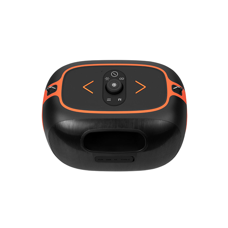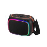This speaker combines ABS plastic, fabric, and iron metal for a durable yet modern design. Featuring Bluetooth 5.3 connectivity and compatibility with AUX, USB, and TF card inputs, it accommodates diverse playback needs. Equipped with dual handheld microphones, it’s ideal for family gatherings, karaoke, dance parties, and outdoor events. Built-in multicolor RGB lighting effects enhance the party atmosphere.