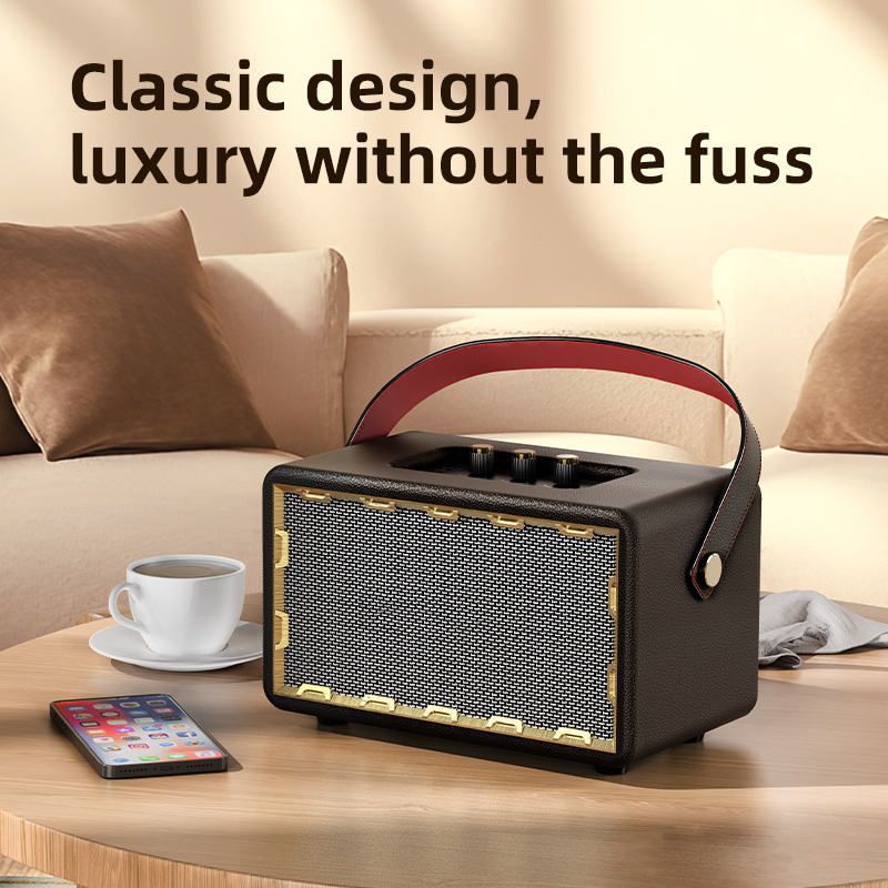 This retro speaker features a premium leather body with a soft, refined feel and an elegant, vintage look that exudes high-end sophistication. A leather carry handle makes it easy to carry, allowing you to enjoy music at home, in the office, or outdoors. Built-in high-quality speakers deliver stereo sound with rich bass and clear treble for an immersive listening experience. Bluetooth wireless connectivity allows for quick pairing with phones, tablets, and other devices for convenient wireless music playback.